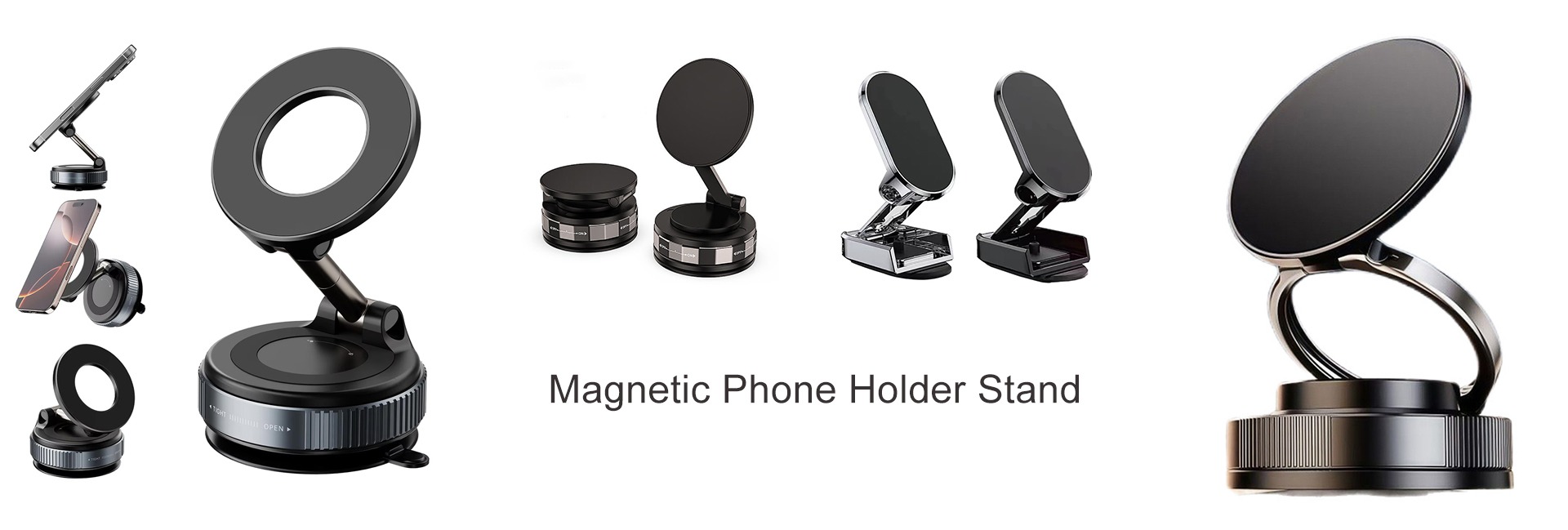 Supporto Magnetico Pieghevole per Telefono in Lega con Forte Magnete per Scrivania, Muro, Auto con Ventosa per Parabrezza, Cruscotto, Finestrino